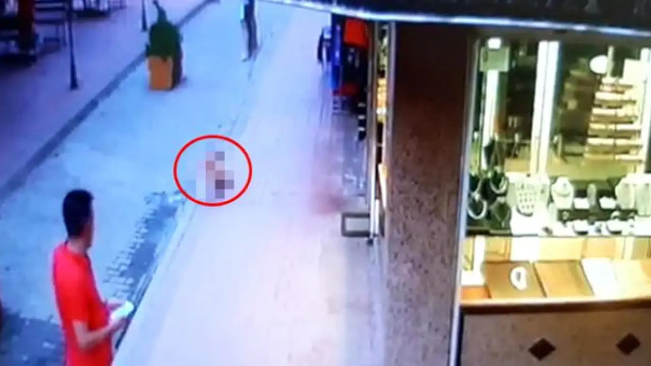 Bir iş yerinin güvenlik kamerasınca kaydedilen görüntüde, çocuğun düştüğünü gören çarşı esnafından bazılarının panik ve üzüntü yaşaması, bazılarının ise yardıma koşması yer alıyor.