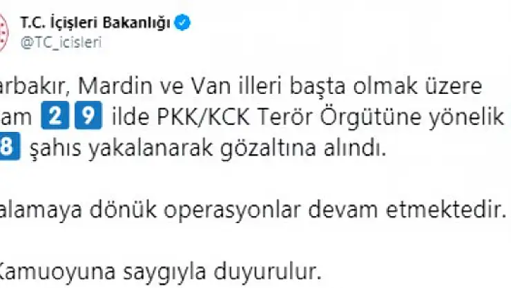 "Diyarbakır, Mardin ve Van illeri başta olmak üzere toplam 29 ilde PKK/KCK Terör Örgütüne yönelik 418 şahıs yakalanarak gözaltına alındı. Yakalamaya dönük operasyonlar devam etmektedir."