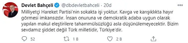 "Milliyetçi Hareket Partisi'nin sokakta işi yoktur. Kavga ve karışıklıkta hayır görmesi imkansızdır. İnsan onuruna ve demokratik adaba uygun olarak yapılan makul eleştirilere tahammülsüzlüğü asla düşünülemeyecektir. Bizim sevdamız şiddet değil Türk milletidir, Türkiye'dir. Ülkücüler Hak yolundan dönmez, halkın çizgisinden sapmaz, hakkını yedirmez, haksızlığa asla gelmez. Ya devlet başa ya kuzgun leşe dememizin esası da budur. Hiç kimse sabrımızı yanlışa yormamalı, kutlu davamızın emanetlerini çiğnemeye kalkışmamalıdır.Serok Ahmet ümidini dış güçlere bağlamasın, Kobani'ye selam gönderdiği yıllar geride kalmıştır. Başkasının metruk kayığına binenlerin istikameti sahil değil bataklığın ta dibidir. Milliyetçi Ülkücü Hareket herkesin hayat, düşünce, inanç ve ifade hakkına saygı duyar. Önemle altını çiziyorum ki, eleştirilere saygı duymamız için ahlaki, meşru ve hukuki olması şarttır" dedi.