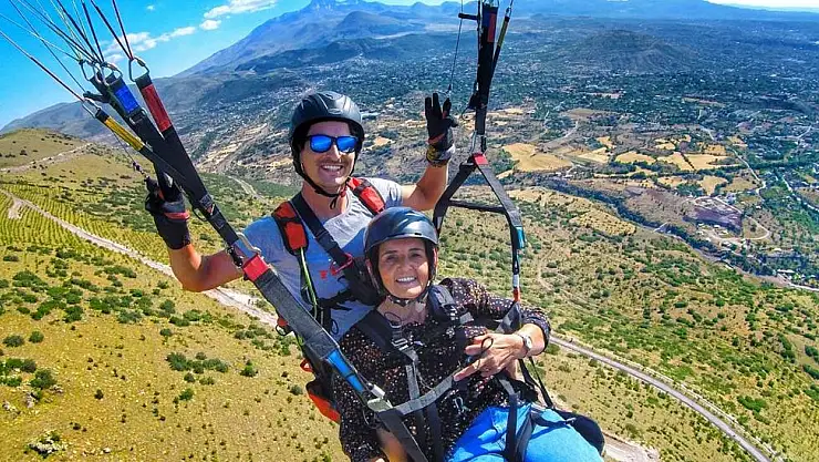 Almanya'dan yaz tatili için memleketi Kayseri'ye gelen 61 yaşındaki kadın, Ali Dağı'ndan havalanan paraşütte uçmak istedi. Flyman Paragliding Tandem Yamaç Paraşütü Pilotu Ömer Kayalı idaresindeki paraşüt ile 2 bin rakımlı Ali Dağı'ndan atladı. Yaklaşık yarım saat süren uçuşta eğlenceli anlar yaşayan gurbetçi kadın, pilot Ömer Kayalı'nın "Biraz sallayayım mı? Eğer rahatsız olursanız söyleyin" sözlerine "Biraz bir şeyler olsun" diyerek heyecan istedi.