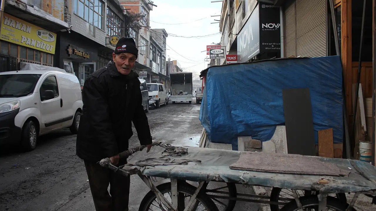 Kayseri'de yaşayan 3 çocuk babası Rıfat Kartal (72), Eski Sanayi'de 4 tekerlekli el arabası ile 20 yıldır taşımacılık yaparak geçimini sağlıyor.