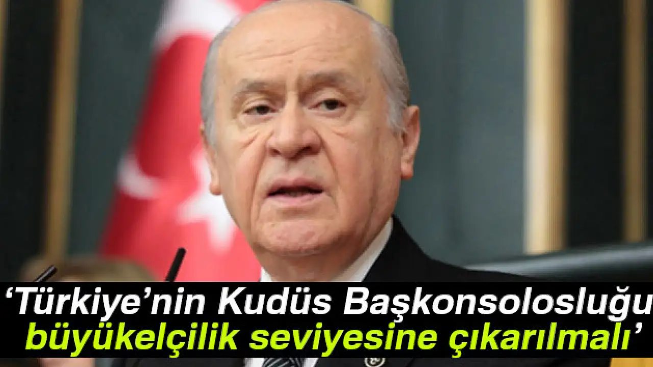MHP Genel Başkanı Devlet Bahçeli, “Görev alanı Doğu Kudüs ile Filistin Ulusal Yönetimi’ne bağlı bulunan Batı Şeria ve Gazze’den oluşan Türkiye’nin Kudüs Başkonsolosluğu resmen büyükelçilik seviyesine çıkarılmalıdır" dedi.