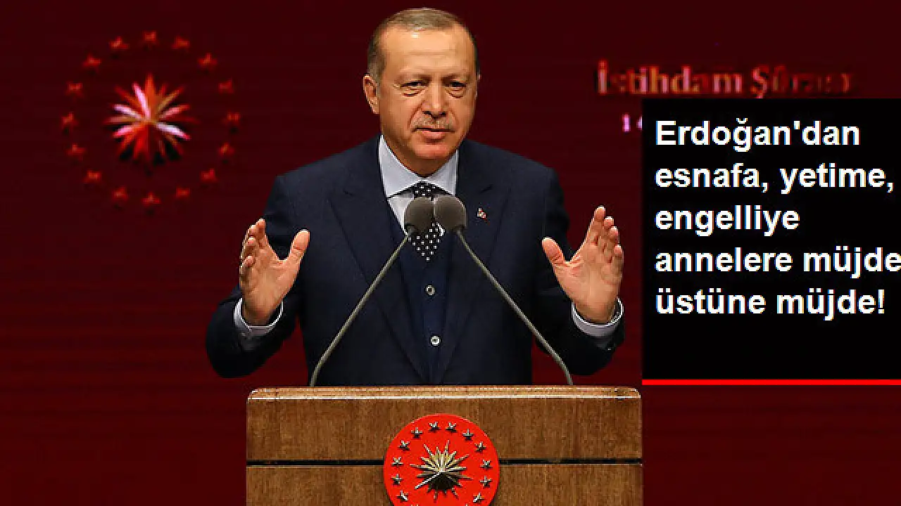 İstihdam Şurasında konuşan Cumhurbaşkanı Erdoğan, iş dünyasına, esnafa, yetimlere, engelliye, annelere ve yeşil pasaport sahibi gençlere müjde üstüne müjde verdi.
