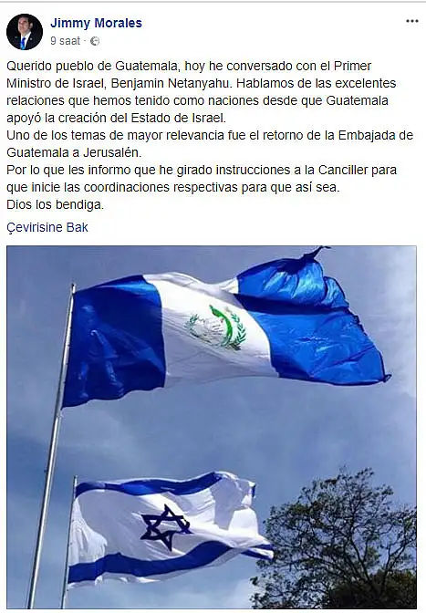 Guatemala Devlet Başkanı Jimmy Morales, sosyal medya hesabından İsrail'deki elçiliğini Kudüs'e taşımayı planladıklarını açıkladı. Morales, İsrail Başbakanı Benjamin Netenyahu ile görüştüklerini ve Dışişleri Bakanlığına Büyükelçiliği taşımak için süreci başlatma talimatını verdiğini belirtti.