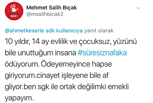 10 yıldır, 14 ay evlilik ve çocuksuz, yüzünü bile unuttuğum insana #süresiznafaka ödüyorum. Ödeyemeyince hapse giriyorum. Cinayet işleyene bile af geliyor. Ben SGK ile ortak değilim ki emekli yapayım.