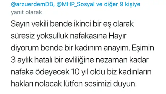 Ben de bir kadınım, anayım. Eşim, 3 aylık hatalı bir evliliğine ne zamana kadar nafaka ödeyecek. 10 yıl oldu biz kadınların hakları ne olacak lütfen sesimizi duyun.