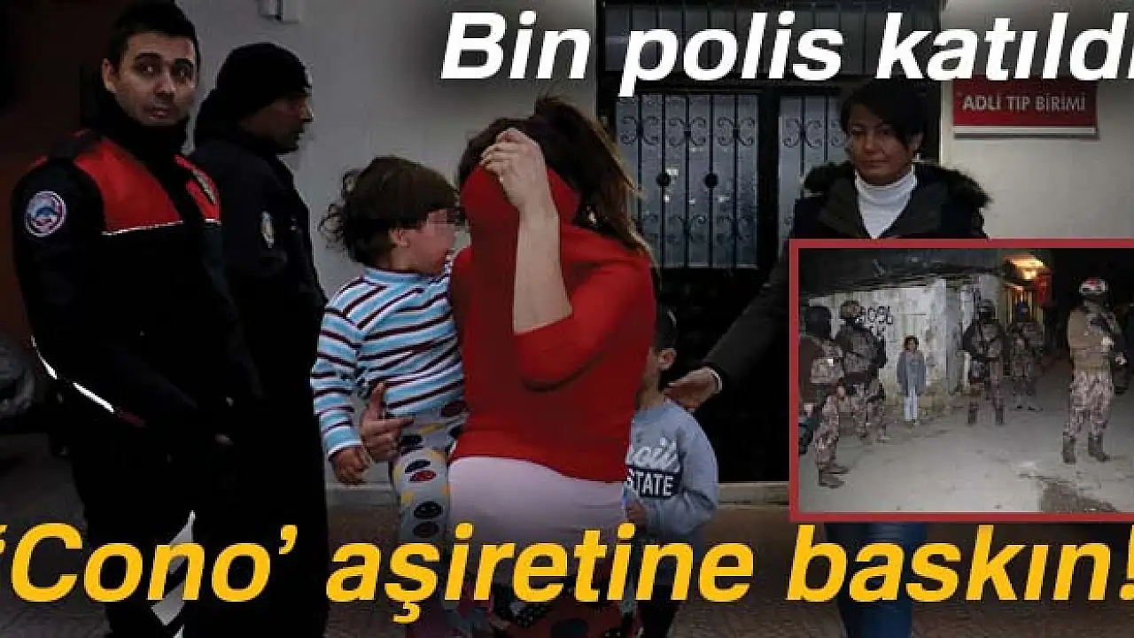 'Cono' aşiretine bin polisle şafak baskını Adana ve Mersin'de aşk vaadiyle dolandırıcılık, yağma, gasp, hırsızlık yaptıkları ve uyuşturucu sattıkları iddia edilen Cono aşiretine yönelik bin polis ile düzenlenen eş zamanlı operasyonda 30'dan fazlası kadın