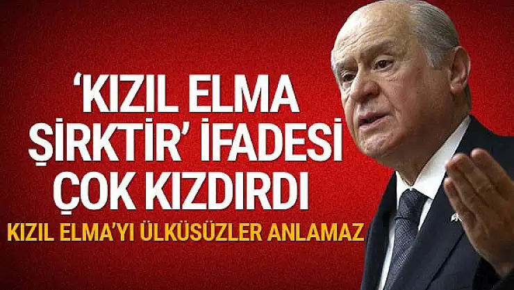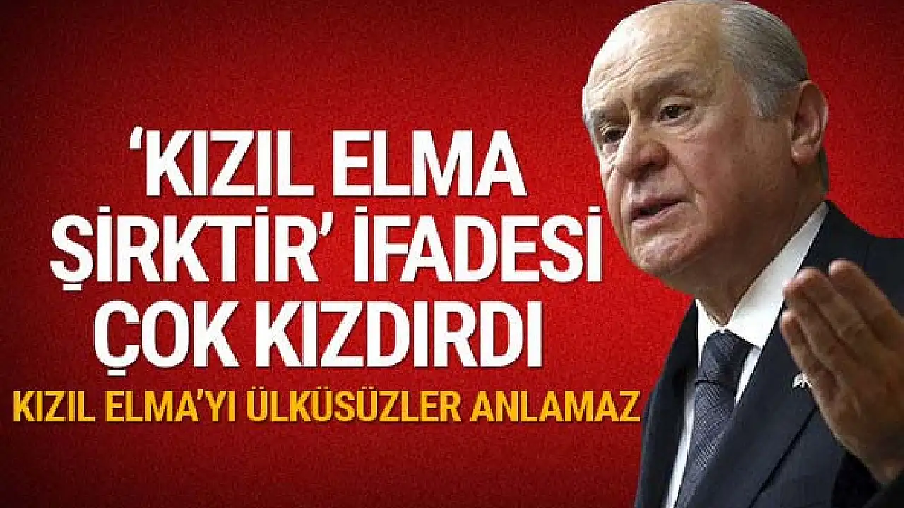 'Kızıl Elma Şirktir' İfadesi Çok Kızdırdı MHP Lideri Devlet Bahçeli, Kızıl Elma ülküsüyle ilgili, 'Kızıl Elma, pazarda alınıp-satılan elma değildir.Türk milletinin milli varlığının istikbal nurudur.
