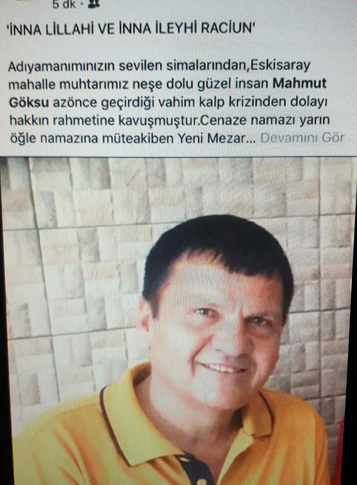 Muhtarın öldüğü haberi sosyal medyayı karıştırdı Adıyaman'da, sosyal medya üzerinden Eskisaray Mahalle Muhtarı Mahmut Göksu'nun öldü diye yapılan paylaşımlar sosyal medyayı karıştırdı.Öldü sanılan muhtar, sosyal medya hesabından canlı yayın yapıp, 'Ben öl