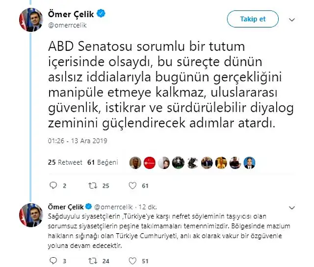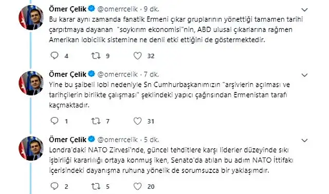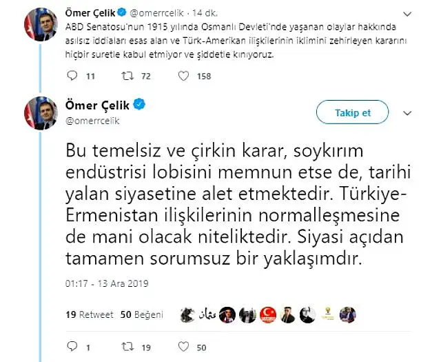 AK Parti Basın Sözcüsü Ömer Çelik, ABD Senatosu'nun sözde Ermeni Soykırımı ile ilgili aldığı kararı sosyal medya hesabından eleştirdi.
