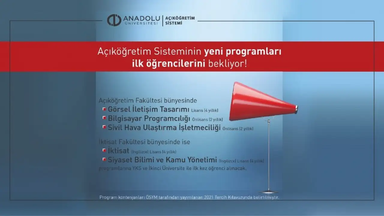 Türkiye’nin açık ve uzaktan öğrenmede öncü kurumu olan Açıköğretim Sistemi (AÖF) de bu tercih döneminde yeni açılan programlarına ilk öğrencilerini alacak olmanın heyecanını yaşıyor. Bu yıl ilk kez öğrenci alınacak lisans programları Açıköğretim Fakültesi’ne bağlı Görsel İletişim Tasarımı ve İktisat Fakültesi’ne bağlı İngilizce İktisat ve İngilizce Siyaset Bilimi ve Kamu Yönetimi iken açılan yeni önlisans programları ise Bilgisayar Programcılığı ve Sivil Hava Ulaştırma İşletmeciliği oldu. Öğrenci Seçme ve Yerleştirme Merkezi (ÖSYM) tarafından yayımlanan 2021 Yükseköğretim Kurumları Sınavı Yükseköğretim Programları ve Kontenjanları Kılavuzu’nda verilen bilgiye göre AÖF Görsel İletişim Tasarımı lisans programına 400 genel ve 10 okul birincisi kontenjanı, İktisat Fakültesi İngilizce İktisat ve İngilizce Siyaset Bilimi ve Kamu Yönetimi lisans programlarına da 150’şer genel 4’er okul birincisi kontenjanı verildi. AÖF Bilgisayar Programcılığı ve Sivil Hava Ulaştırma İşletmeciliği önlisans programlarına ise 600’er genel 15’er de okul birincisi kontenjanı verildi. Adaylar bu yıl düzenlenen Yükseköğretim Kurumları Sınavında aldıkları Temel Yeterlilik Testi (TYT) puanları ile önlisans programlarına tercih yapabilirken Görsel İletişim Tasarımı lisans programı için Sözel (SÖZ), İngilizce İktisat ve Siyaset Bilimi ve Kamu Yönetimi lisans programları için ise Eşit Ağırlık (EA) puanlarını kullanabilecek. Söz konusu yeni programlara İkinci Üniversite kayıt türü kapsamında da kontenjan sınırı olmaksızın öğrenci alımı yapılacak.