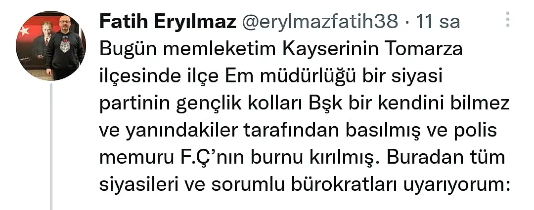 Kayseri Tomarza İlçe Emniyet Müdürlüğü, AK Parti Tomarza Gençlik Kolları Başkanı Hakan Korkmaz ve yanında bulunan kişiler tarafından basılarak polis memuru F.Ç.’yi darp edip burnunu kırdı. Emekli Gazi Emniyet Müdürü Fatih Eryılmaz, yayınladığı paylaşımda, “Bugün memleketim Kayseri’nin Tomarza ilçesinde İlçe Emniyet Müdürlüğü bir siyasi partinin gençlik kolları başkanı bir kendini bilmez ve yanındakiler tarafından basılmış ve polis memuru F.Ç.’nin burnu kırılmış. Buradan tüm siyasileri ve sorumlu bürokratları uyarıyorum” ifadelerinde bulundu.