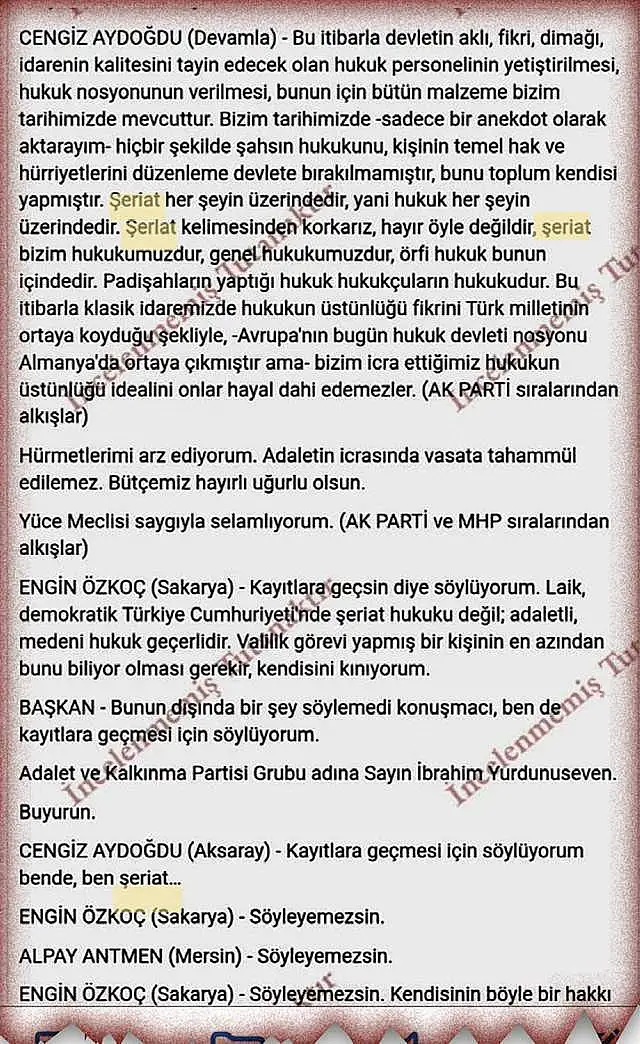 AKP Aksaray Milletvekili Cengiz Aydoğdu, bütçe görüşmeleri sırasında Meclis kürsüsünden 'Şeriat bizim hukukumuzdur.' ifadelerini kullandı.