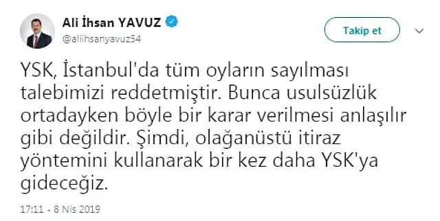 Yavuz, Twitter hesabından yaptığı paylaşımda, "YSK, İstanbul'da tüm oyların sayılması talebimizi reddetmiştir. Bunca usulsüzlük ortadayken böyle bir karar verilmesi anlaşılır gibi değildir. Şimdi, olağanüstü itiraz yöntemini kullanarak bir kez daha YSK'ye gideceğiz." ifadelerini kullandı.