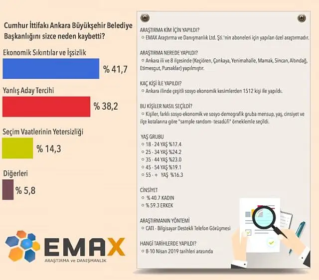 EMAX Araştırma; Ankara'nın 8 ilçesinde (Keçiören, Çankaya, Yenimahalle, Mamak, Sincan, Altındağ, Etimesgut, Pursaklar) 8-10 Nisan tarihleri arasında "Cumhur İttifakı, Ankara Büyükşehir Başkanlığı'nı sizce neden kaybetti?" sorusunu yönetti.