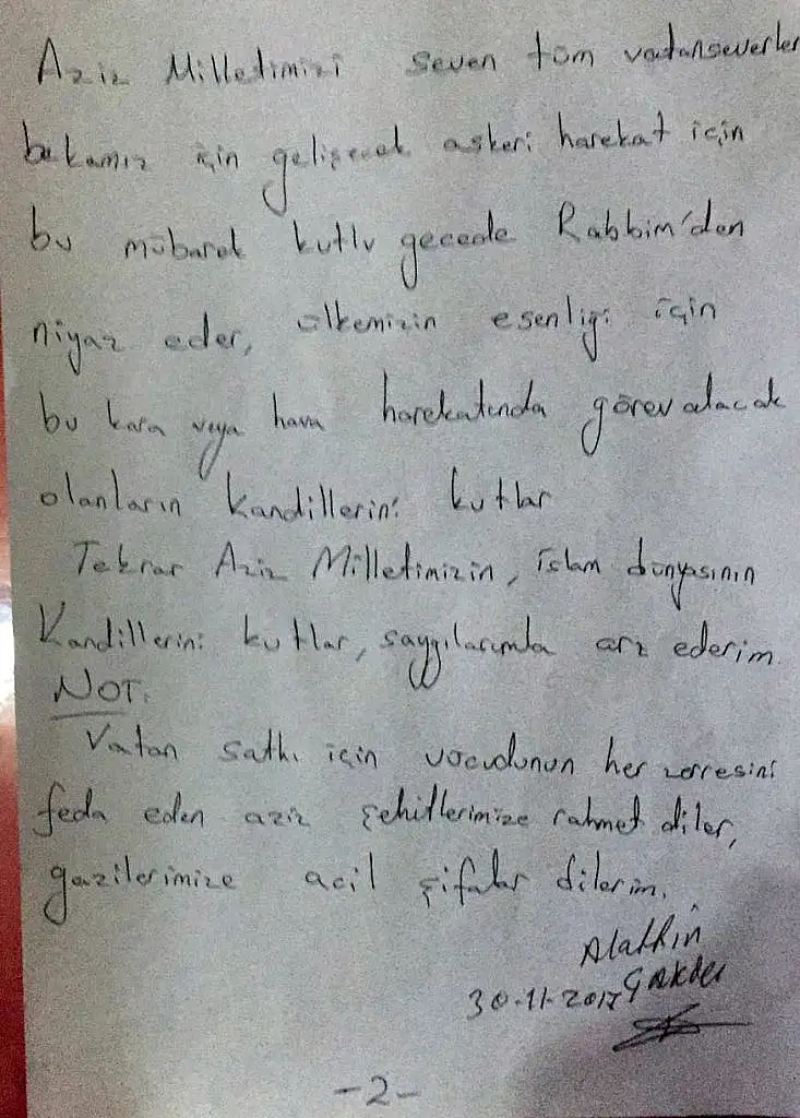 Aziz Milletimizin ve İslam dünyasının Kandilini kutlar, Ülkemizin bekasının söz konusu olduğu bu zorlu süreçte tüm vatanseverlerin Afrin ile ilgili daha duyarlı olup Devletimizin yanında yer almasını yürekten dilerken iktidar, iktidara yakın olan, bölücülük yapmayan, ülkesini seven tüm vatanseverlerin Afrin’de gelişecek her türlü ülkemize yapılan saldırılara karşı angajman kuralları gereği cevap verileceği, gerekirse kara harekatı yapılacağını Türkiye’nin üzerinde by-pas yapmak isteyenler ve onun işbirlikçilerinin kafalarına yazmaları Aziz Milletimizi seven tüm vatanseverler bekamız için gelişecek askeri harekat için bu mübarek kutlu gecede Rabbim’den niyaz eder, ülkemizin esenliği için bu kara veya hava harekatında görev alacak olanların Kandillerini kutlar, tekrar azil milletimizin, İslam dünyasının Kandillerini kutlar, saygılarımla arz ederim.