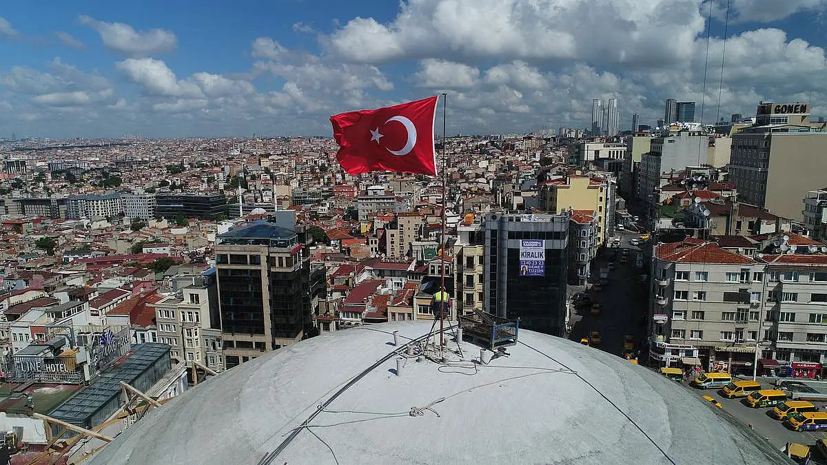 Ana kubbesi kapatılan Taksim Camii havadan görüntülendi.Türk bayrağının Taksim Camii'nin tepesine asılmasının ardından Al bayrağın kubbenin üzerinde dalgalanan görüntüsü kendine hayran bıraktı.