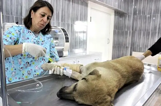 Bursa'da bir aracın çarpması sonucu ayağı kırılan köpek, Büyükşehir Belediyesi Sokak Hayvanları Tedavi Merkezi'nde ameliyat edildi. Sağ ön ayağından yaralanan köpek, tedavi sırasında gözyaşı döktü.