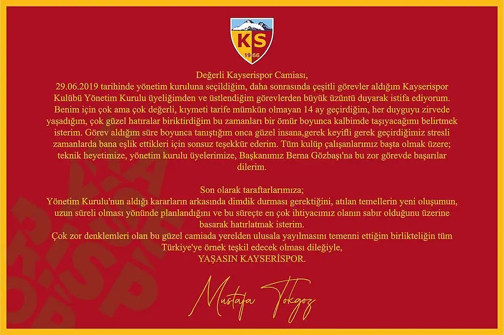 "Değerli Kayserispor Camiası, 29.06.2019 tarihinde yönetim kuruluna seçildiğim, daha sonrasında çeşitli görevler aldığım Kayserispor Kulübü Yönetim Kurulu üyeliğimden ve üstlendiğim görevlerden büyük üzüntü duyarak istifa ediyorum. Benim için çok ama çok değerli, kıymeti tarife mümkün olmayan 14 ay geçirdiğim, her duyguyu zirvede yaşadığım, çok güzel hatıralar biriktirdiğim bu zamanları bir ömür boyunca kalbimde taşıyacağımı belirtmek isterim. Görev aldığım süre boyunca tanıştığım onca güzel insana, gerek keyifli gerek geçirdiğimiz stresli zamanlarda bana eşlik ettikleri için sonsuz teşekkür ederim. Tüm kulüp çalışanlarımız başta olmak üzere; teknik heyetimize, yönetim kurulu üyelerimize, başkanımız Berna Gözbaşı'na bu zor görevde başarılar dilerim. Son olarak taraftarlarımıza; yönetim kurulunun aldığı kararların arkasında dimdik durması gerektiğini atılan temellerin yeni oluşumun, uzun süreli olması yönünde planlandığını ve bu süreçte en çok ihtiyacımız olanın sabır olduğunu üzerine basarak hatırlatmak isterim. Çok zor denklemleri olan bu güzel camiada yerelden ulusala yayılmasını temenni ettiğim birlikteliğin tüm Türkiye'ye örnek teşkil edecek olması nedeniyle, Yaşasın Kayserispor" ifadelerini kulllandı.