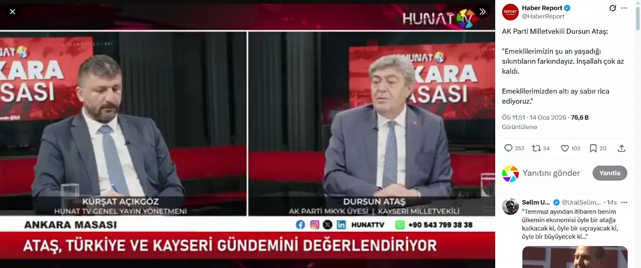 AK Parti MKYK Üyesi ve Kayseri Milletvekili Dursun Ataş, Hunat TV Ankara stüdyosunda Genel Yayın Yönetmeni Kürşat Açıkgöz’ün sorularını yanıtladı. Ankara Masası programında bütçe görüşmeleri kapsamında en düşük emekli maaşlarının 20 bin lira bandına çekilmesinin hedeflendiğini ve maaşlı ile dar gelirli vatandaşların asıl rahatlamayı 2026 yılının ikinci yarısından sonra daha net hissedeceğini ifade eden Ataş’ın sözleri, sosyal medya kullanıcıları tarafından yoğun şekilde yorumlandı. Açıklamalar kimi kesimler tarafından temkinli bir beklentiyle karşılanırken, kimi kullanıcılar ise sürecin net bir takvime bağlanmasını olumlu bulduklarını dile getirdi.