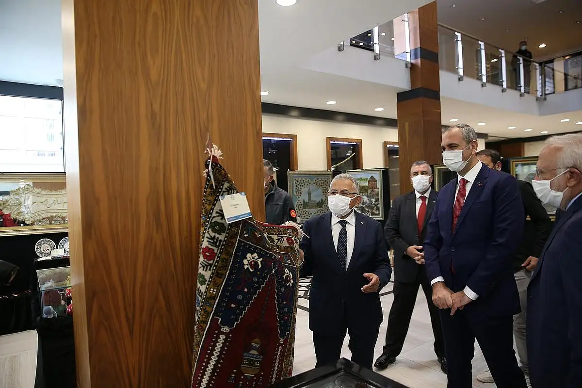Başkan Büyükkılıç, Bakan Gül’ü Başkanlık giriş kapısında çiçeklerle karşılarken, Bakan Gül, Büyükşehir Belediyesi Başkanlık Giriş Salonu’nda ziyarete açılan kadın kursiyerlerin hazırladığı el emeği, göz nuru eserlerin yer aldığı sergiyi gezdi.