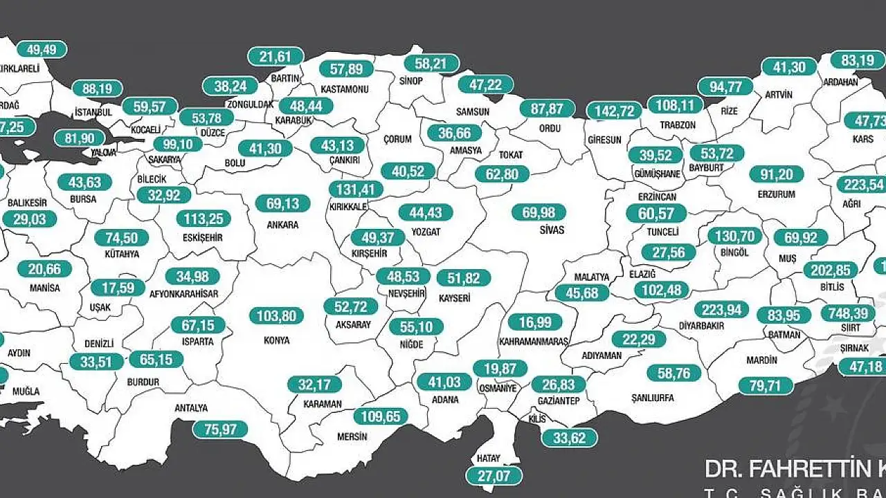 Güncel haritaya göre 100 bin nüfusta 748,39 kişi ile en çok vaka görülen il Siirt oldu.