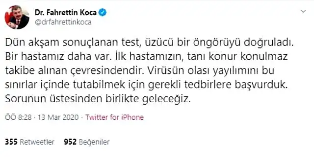 Sağlık Bakanı Koca, sosyal medya hesabından yaptığı açıklamada, "Dün akşam sonuçlanan test, üzücü bir öngörüyü doğruladı. Bir hastamız daha var. İlk hastamızın, tanı konur konulmaz takibe alınan çevresindendir. Virüsün olası yayılımını bu sınırlar içinde tutabilmek için gerekli tedbirlere başvurduk. Sorunun üstesinden birlikte geleceğiz." ifadelerini kullandı.