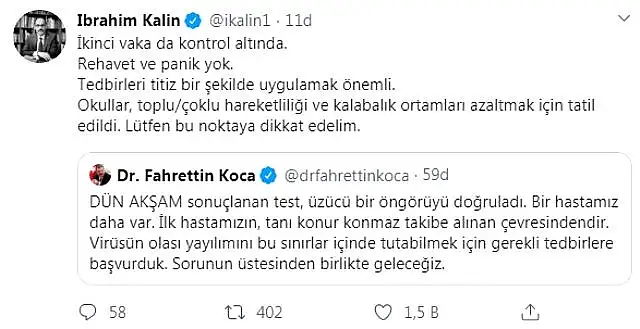 Cumhurbaşkanlığı Sözcüsü İbrahim Kalın da, Sağlık Bakanı Fahrettin Koca'nın açıklamasını alıntılayarak bir açıklamada bulundu. Kalın, açıklamasında; "İkinci vaka da kontrol altında. Rehavet ve panik yok. Tedbirleri titiz bir şekilde uygulamak önemli. Okullar, toplu/çoklu hareketliliği ve kalabalık ortamları azaltmak için tatil edildi. Lütfen bu noktaya dikkat edelim" ifadelerini kullandı.