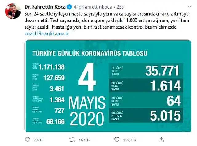 Türkiye'deki koronavirüs salgınıyla ilgili 5 Mayıs verilerini paylaştığı açıklamasında salgınla ilgili uyarılarda bulunan Sağlık Bakanı Fahrettin Koca, "Vaka sayısında, seyirde görülebilecek kısmi bir artış var. Yeni bir dönemdeyiz. Salgına fırsat tanımamalıyız" dedi. Koca'nın işaret ettiği yeni vaka sayısı dün 1614'ten bugün 1832'ye yükseldi.