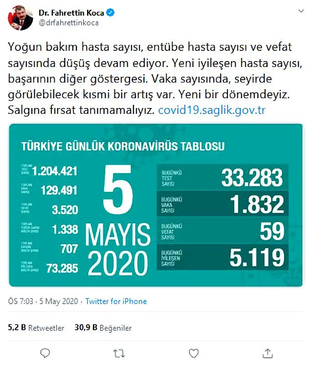 Türkiye'deki koronavirüs salgınıyla ilgili 5 Mayıs verilerini paylaştığı açıklamasında salgınla ilgili uyarılarda bulunan Sağlık Bakanı Fahrettin Koca, 'Vaka sayısında, seyirde görülebilecek kısmi bir artış var.Yeni bir dönemdeyiz.