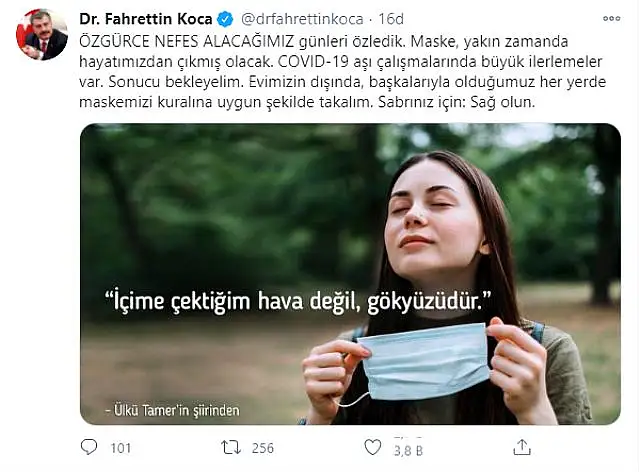 Sosyal medya hesabından paylaşımda bulunan Koca, "Özgürce nefes alacağımız günleri özledik. Maske, yakın zamanda hayatımızdan çıkmış olacak." ifadelerini kullandı.