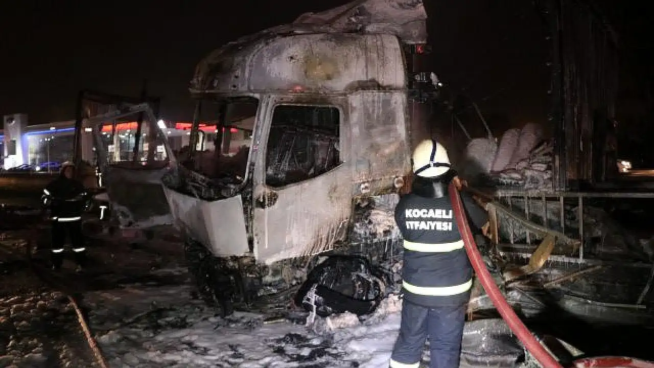 Kocaeli'de bariyerlere çarpan tır metrelerce sürüklendikten sonra alevler içinde kaldı.Sürücünün hafif yaralandığı kazada, tır alev topuna dönerken geriye yalnızca iskeleti kaldı.