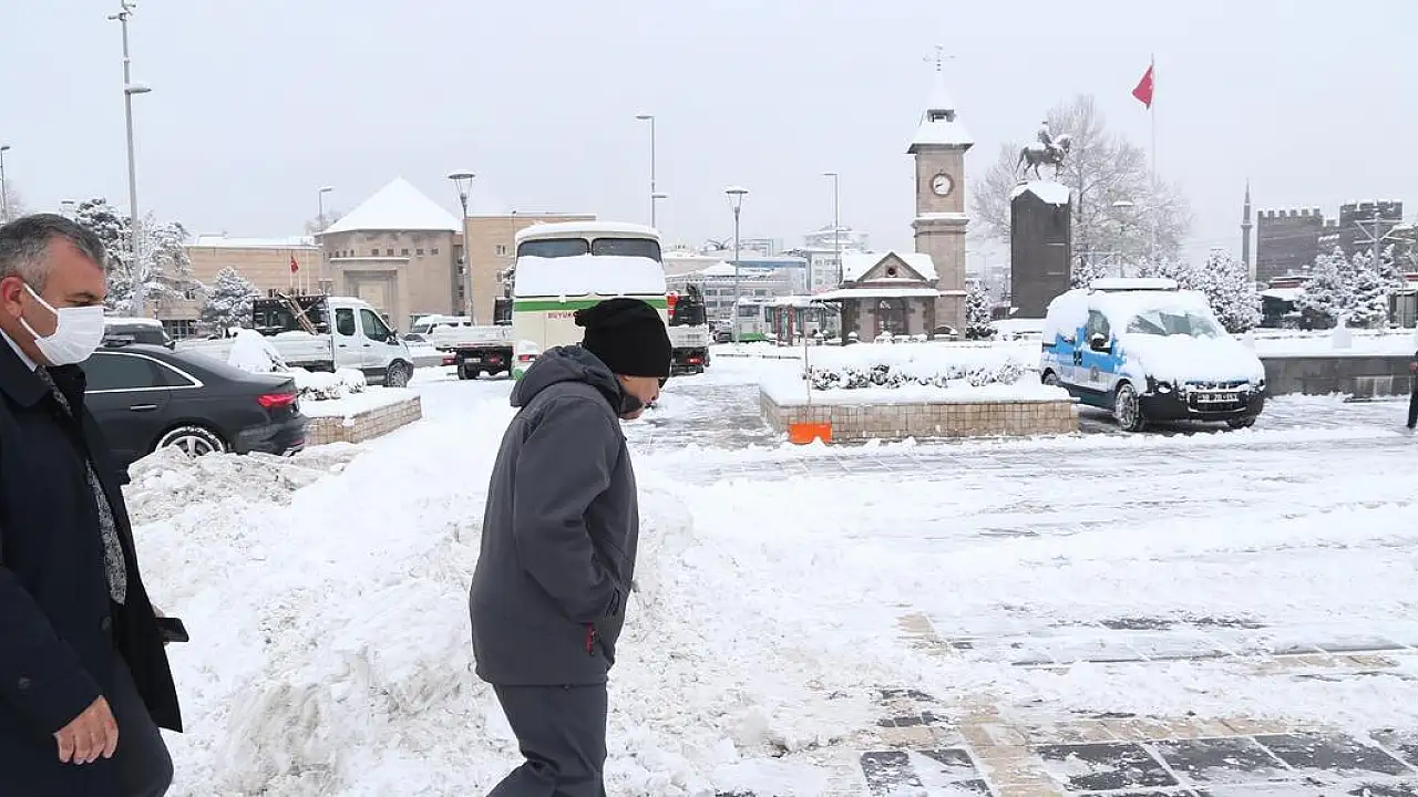 Cumhuriyet Meydanı’nda kaldırım ve yaya yolu karla mücadele çalışmalarını denetleyen Büyükşehir Belediye Başkanı Dr. Memduh Büyükkılıç, ekiplere kolaylıklar diledi.