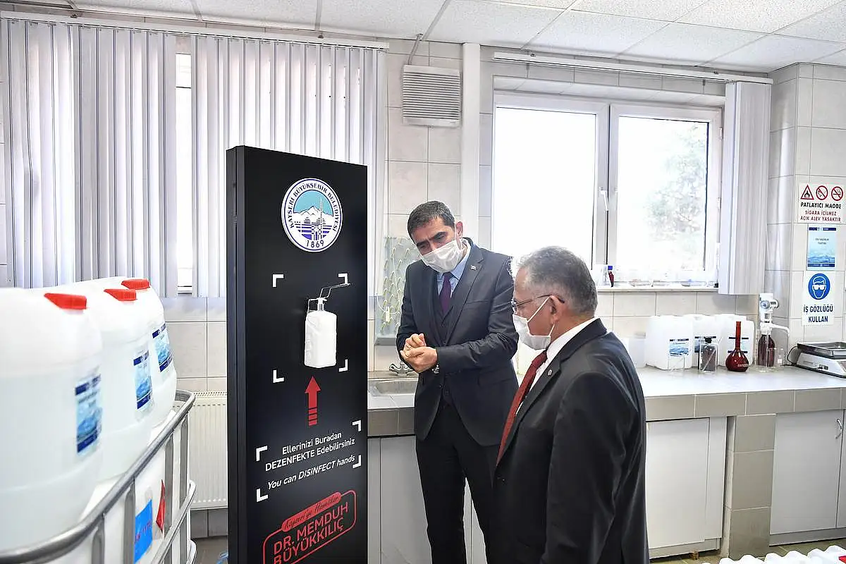 Büyükşehir Belediye Başkanı Dr. Memduh Büyükkılıç, dezenfektan üretimi için Tarım ve Orman Bakanlığı’ndan gerekli iznin alındığını söyledi. Bu süreçte ekonomik maliyeti düşürmek ve başta sağlık kurumları olmak üzere kamu kurum ve kuruluşlarının ihtiyaçlarını karşılamak üzere çalışma başlattıklarını ifade eden Başkan Büyükkılıç, üretilen dezenfektan ile hastanelere destek olduklarını belirtti. Başkan Büyükkılıç, yine KASKİ tarafından oluşturulan dezenfektan ünitelerinin de hastane girişleri ile şehrin insan yoğun bölgelerine konularak vatandaşlara hizmet verileceğini kaydetti.