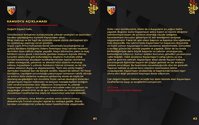 Kayserispor Başkanı Ali Çamlı, Süper Lig'in 11.haftasında oynanan ve golsüz beraberlikle biten Adana Demirspor maçı sonrası yaşanan olaylar sebebiyle kulübün sosyal medya hesaplarından yazılı açıklama yaptı.