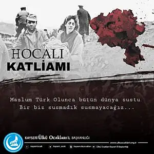 Ermeniler tarafından 29 yıl önce bugün, 613 Azeri halkın acımasızca katledildiğini hatırlatan Ülkü Ocakları Kayseri İl Başkanı Ali Çelik, Hocalı’da ki katliamı 100 yıl geçse de unutmayacağın ı söyledi. Hocalı’da kanayan yaranın hala kabuk bağlamadığını söyleyen Başkan Çelik; “29 yıl önce, Azerbaycan’ın Dağlık Karabağ bölgesinde bulunan Hocalı kasabasında Ermeni çeteleri ve 366. Rus Motorize Alayı tarafından sahnelenen vahşet, 21’nci asrın en büyük facialarından ve felaketlerinden biri olarak tarihe geçmiştir. 1. Dünya Savaşınsa Anadolu'da katliamlar yapan Ermeniler, 26 Şubat 1992 tarihinde Hocalı’da benzer bir katliam yapmışlardır. Yıllardır Ermeni yalanlarına kanan, sözde insan hakları savunucuları bu katliama sessiz kalmıştır. Soykırım Türk’e ve mazluma yapılınca soykırım savunucusu imzacılar sus pus olmuştur. Unutulmasın ki biz Türk milliyetçileri, Ülkücüler; Türk Milleti’ne karşı yapılan bu soykırımı üzerinden 29 yıl değil 100 yıl dahi geçse unutmayacağız. Gözlerini bu zalimlerin yaptıklarına kapatan, kulaklarını masum insanların çığlığına tıkayan terör hamilerine de hiçbir zaman geçit vermeyeceğiz” ifadelerine yer verdi.