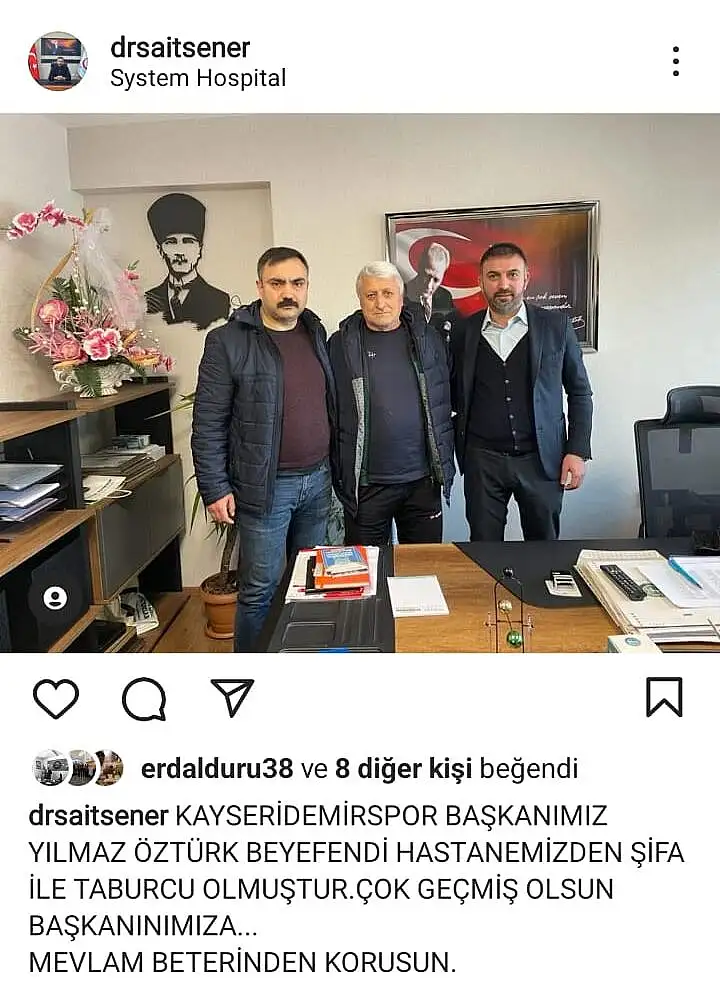 Kayseri'de çıkan bıçaklı kavgada amatör lig ekiplerinden Demirspor Kulübü'nün Başkanı Yılmaz Öztürk yaralanmıştı. Başkan Öztürk tedavi edilmek üzere System Hastanesi’ne kaldırılmıştı. Tedavisi tamamlanarak sağlığına kavuşan Başkan Öztürk, Op. Dr. Gökbörü Bedir, Op. Dr. Fatih Mutlu ve System Hastanesi’ne ilgisinden dolayı teşekkür etti.