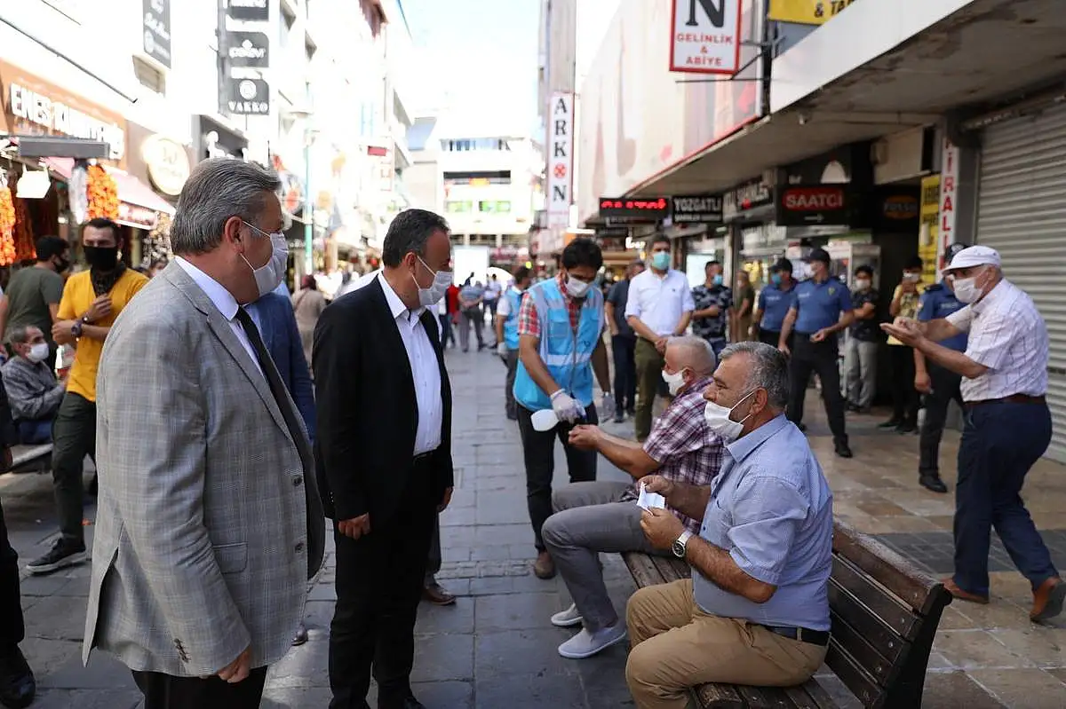 Melikgazi Belediye Başkanı Dr. Mustafa Palancıoğlu ve Melikgazi Kaymakamı Bülent Karacan Kazancılar Çarşısı’nda gerçekleştirilen korona virüs tedbirleri denetiminde vatandaşlara, temizlik, maske ve mesafe kuralını hatırlattı.