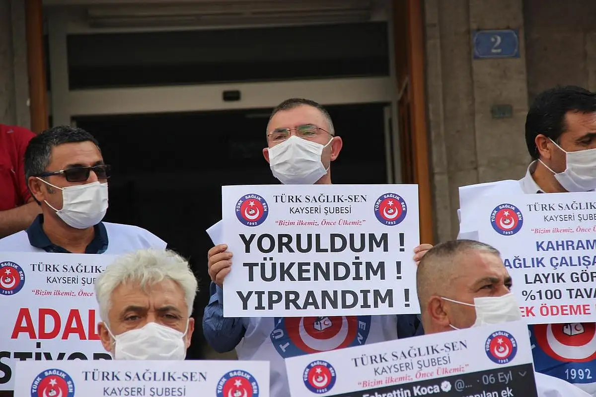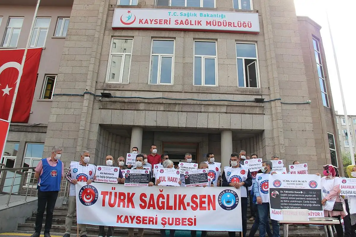 Türk Sağlık-Sen Kayseri Şube Başkanı Kamil Ünal ve sendika üyesi sağlık çalışanları, pandemide sağlık çalışanlarına vaat edilen ek ödemelerin adaletsiz ve yetersiz olması konusunda basın açıklamasında bulundu.Kayseri İl Sağlık Müdürlüğü binası önünde gerç