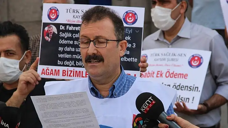 Türk Sağlık-Sen Kayseri Şube Başkanı Kamil Ünal ve sendika üyesi sağlık çalışanları, pandemide sağlık çalışanlarına vaat edilen ek ödemelerin adaletsiz ve yetersiz olması konusunda basın açıklamasında bulundu. Kayseri İl Sağlık Müdürlüğü binası önünde gerçekleşen basın açıklamasında konuşan Başkan Ünal: "Ek ödeme değil, tek ödeme istiyoruz"dedi.