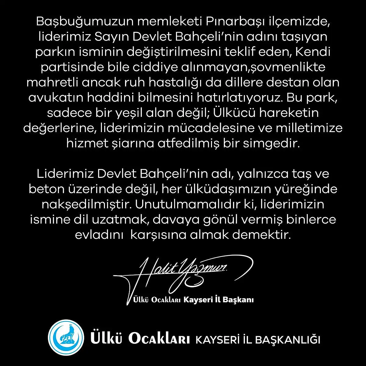 Ülkü Ocakları Kayseri İl Başkanı Halit Yağmur, Pınarbaşı ilçesinde MHP Lideri Devlet Bahçeli'nin adını taşıyan parkın isminin değiştirilmesi için teklifte bulunan CHP'li isme tepki göstererek, "Şovmenlikte maharetli ancak ruh hastalığı da dillere destan olan avukatın haddini bilmesini hatırlatıyoruz. Bu park, sadece bir yeşil alan değil; Ülkücü hareketin değerlerine, liderimizin mücadelesine ve milletimize hizmet şiarına atfedilmiş bir simgedir" dedi.
