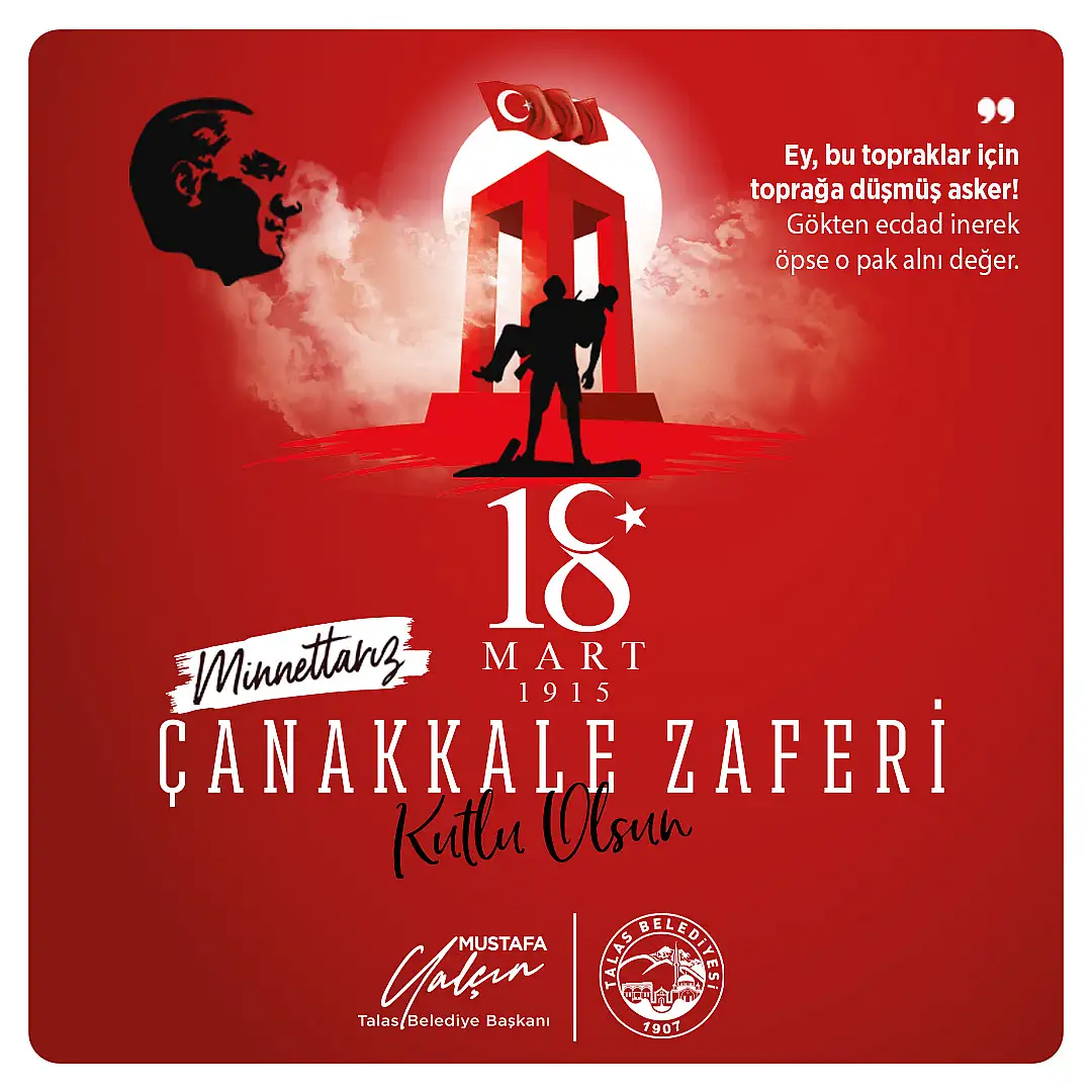 Talas Belediye Başkanı Mustafa Yalçın, 18 Mart Çanakkale Deniz Zaferi'nin anlam ve önemini vurgulayarak, “Vatan savunmasında toprağa verdiğimiz tüm şehitlerimizle helalleşmek istiyorsak, görevimizi en iyi şekilde yapmalıyız.” dedi.