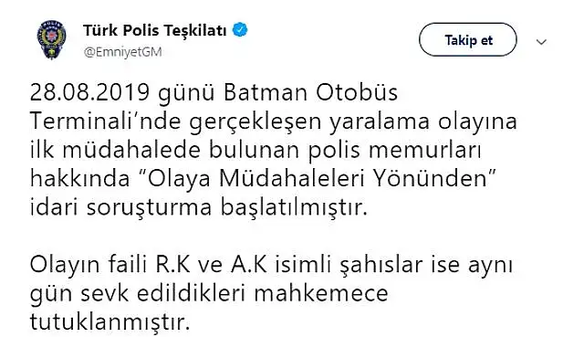 Türk Polis Teşkilatı, Twitter hesabından yaptığı açıklamada, " 28.08.2019 günü Batman Otobüs Terminali'nde gerçekleşen yaralama olayına ilk müdahalede bulunan polis memurları hakkında "Olaya Müdahaleleri Yönünden" idari soruşturma başlatılmıştır. Olayın faili R.K ve A.K isimli şahıslar ise aynı gün sevk edildikleri mahkemece tutuklanmıştır." demişti.