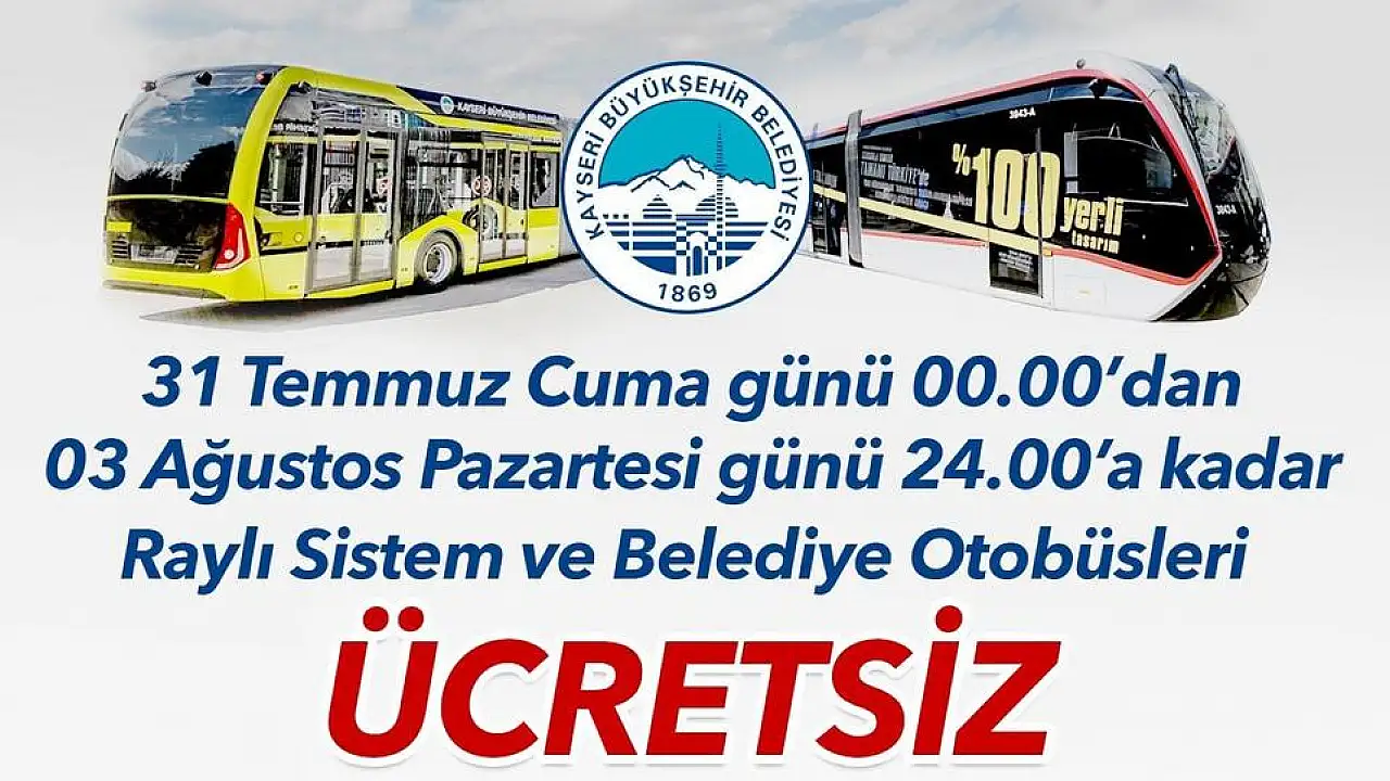 Büyükşehir Belediye Başkanı Dr. Memduh Büyükkılıç, dört gün sürecek Kurban Bayramı’nda otobüslerin ve tramvayların ücretsiz olacağını açıkladı. Başkan Büyükkılıç, “Vatandaşlarımız için şehir içi ulaşımlarını rahat bir şekilde sağlamaları adına otobüs ve raylı sistem seferlerimizi aksatmadan sürdüreceğiz. Ayrıca bayram boyunca belediye otobüslerimiz ve tramvaylarımız ücretsiz hizmet verecek “dedi.