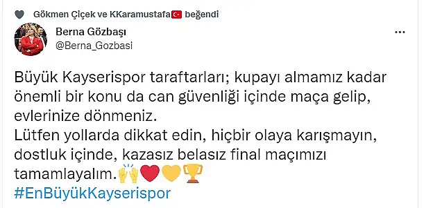 Sosyal medya hesabından paylaşım yapan Gözbaşı, can güvenliği vurgusunda bulundu. Gözbaşı paylaşımında; “Büyük Kayserispor taraftarları; kupayı almamız kadar önemli bir konu da can güvenliği içinde maça gelip, evlerinize dönmeniz. Lütfen yollarda dikkat edin, hiçbir olaya karışmayın, dostluk içinde, kazasız belasız final maçımızı tamamlayalım” ifadelerine yer verdi.