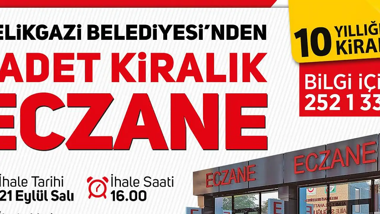 Mülkiyeti Melikgazi Belediyesi'ne ait olan bir adet eczane 21 Eylül Salı günü açık artırma usulüyle 10 yıllığına kiraya verilecek.İhalenin Melikgazi Belediyesi Meclis Salonu'nda saat 16.