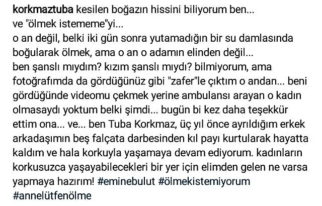 Eskişehir'de 3 yıl önce eski sevgilisi tarafından boğazından 5 kez bıçaklanan Tuba Korkmaz, Emine Bulut'un katledilmesiyle ilgili tepkisini sosyal medyadan haykırdı. Korkmaz, "Kesilen boğazın hissini biliyorum ben... Beni gördüğünde videomu çekmek yerine ambulansı arayan o kadın olmasaydı yoktum belki şimdi" diye konuştu.A"Kasten öldürmeye teşebbüs" suçundan 14 yıl hapis cezası alan ve hiçbir ceza indirimi uygulanmayan eski erkek arkadaşı Fatih S. tarafından 17 Haziran 2016 tarihinde falçata ile boğazından 5 kez bıçaklanan Korkmaz, sosyal medya hesabından yaptığı paylaşımda isyan etti.Korkmaz, "Kesilen boğazın hissini biliyorum ben... ve 'ölmek istememe'yi... O an değil, belki iki gün sonra yutamadığın bir su damlasında boğularak ölmek, ama o an o adamın elinden değil... Ben şanslı mıydım? Kızım şanslı mıydı? Bilmiyorum ama fotoğrafımdan da gördüğünüz gibi zaferle çıktım o andan" diye yazdı.Korkmaz yazısının devamında Emine Bulut olayındaki gibi ağır yaralıyken, çevresindekilerin cep telefonu ile video çekmek yerine kendisine acil tıbbi müdahalede de bulunduğuna dikkat çekerek, "Beni gördüğünde videomu çekmek yerine ambulansı arayan o kadın olmasaydı yoktum belki şimdi. Bugün bi kez daha teşekkür ettim ona.. Ve ben Tuba Korkmaz, üç yıl önce ayrıldığı erkek arkadaşımın beş falçata darbesinden kıl payı kurtularak hayatta kaldım ve hala korkusuyla yaşamaya devam ediyorum. Kadınların korkusuzca yaşayabilecekleri bir yer için elimden gelen ne varsa yapmaya hazırım!" dedi.