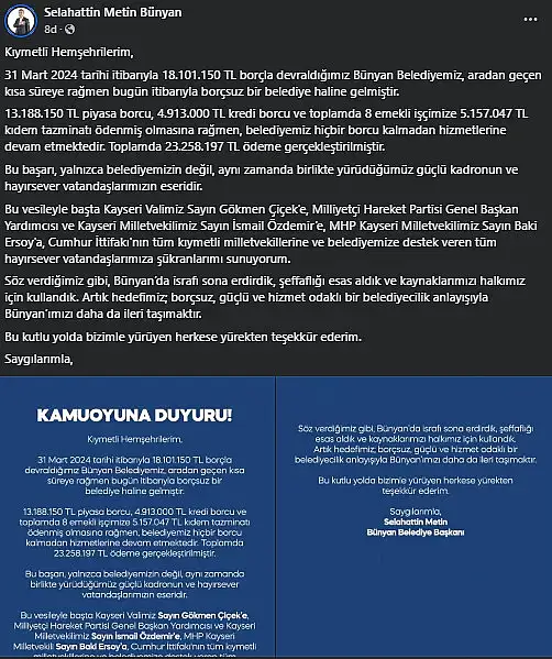 Bünyan Belediye Başkanı Selahattin Metin, belediyenin borçlarını tamamıyla ödediğini belirterek '31 Mart 2024 tarihi itibarıyla 18 milyon 101 bin 150 TL borçla devraldığımız Bünyan Belediyemiz, aradan geçen kısa süreye rağmen bugün itibarıyla borçsuz bir