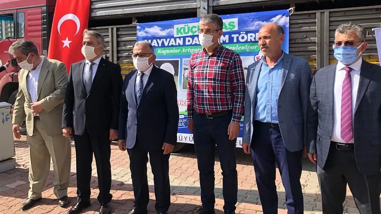 Kayseri Büyükşehir Belediyesi ve Tarım ve Orman İl Müdürlüğü'nün ortak yürüttüğü 'Koyunlar Artıyor Meralar Şenleniyor' projesi ile 11 ilçede yaşayan 55 aileye bin 100 adet damızlık küçükbaş hayvan verildi.Kadir Has Kongre Merkezi otoparkında pandemi koşul
