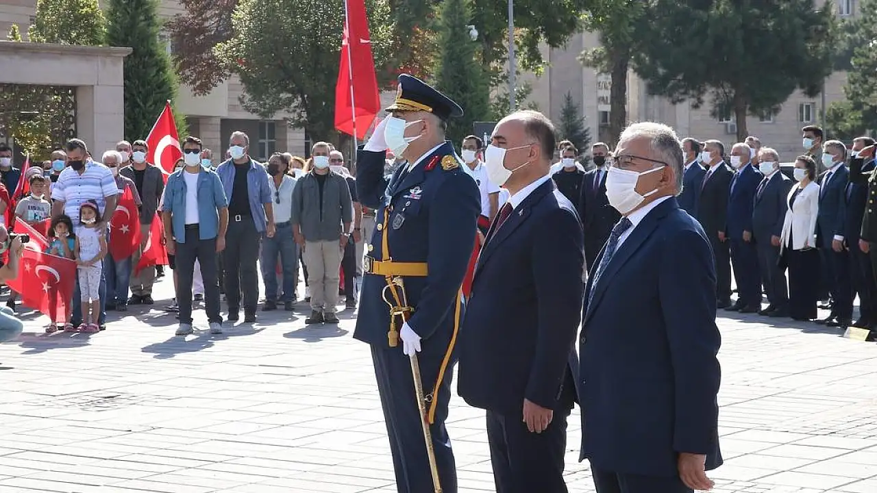 Cumhuriyet Meydanı’nda 30 Ağustos Zafer Bayramı’nın 99. Yıldönümü dolayısıyla düzenlenen törene Kayseri Büyükşehir Belediye Başkanı Dr. Memduh Büyükkılıç’ın yanı sıra Vali Şehmus Günaydın, Garnizon Komutanı Hava Pilot Tuğgeneral Aziz Adalı, Kayseri Milletvekilleri İsmail Tamer, Baki Ersoy, Çetin Arık, Cumhuriyet Başsavcısı Abdulkadir Akın, İl Emniyet Müdürü Kamil Karabörk, kaymakamlar, ilçe belediye başkanları, siyasi parti temsilcileri, rektörler ve protokol üyeleri ile çok sayıda vatandaş katıldı.